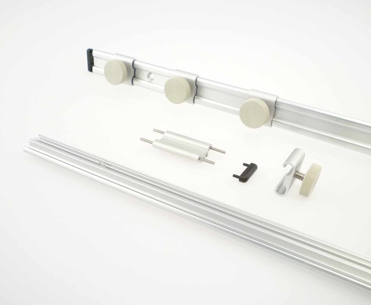 Precision engineered clear anodized, architectural aluminum banner track with adjustable locking thumb screws. Holds grommeted banners taut and sag free. Holes are provided for wall mounting.